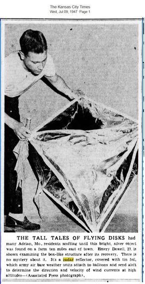 But there is no mystery about it, because it turned out to be a radar reflector, covered with tin foil, which army air base weather units attach to balloons and send aloft to determine the direction and velocity of wind currents at high altitudes.