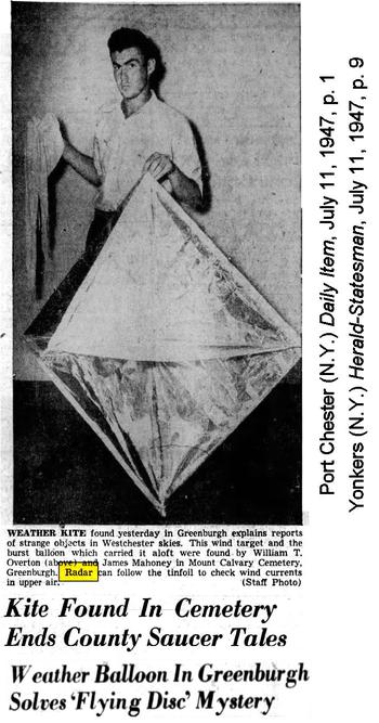 Photo caption: THIS WEATHER KITE found yesterday in Greensburgh explains reports of strange objects in Westchester skies. This wind target and the burst balloon which carried it aloft were found by William T. Overton (above) and James Mahoney in Mounty Calvary Cemetery, Greensburgh. Radar can follow the tinfoil to check wind currents in upper air.