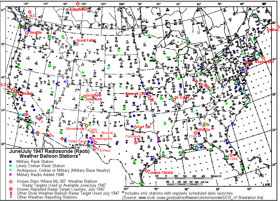 Below is a USA map (adapted from maps used by the Mogul project in their records) showing the distribution of continental USA weather balloon stations back in 1947/48. Each small black circle represents a weather station. Besides recording basics like temperature, humidity, etc., many of these stations also sent up several small pilot or pibal balloons to determine wind direction and speed at altitudes other than ground level. The balloons came in a variety of colors for better visual tracking and hundreds were sent up every day all over the nation.